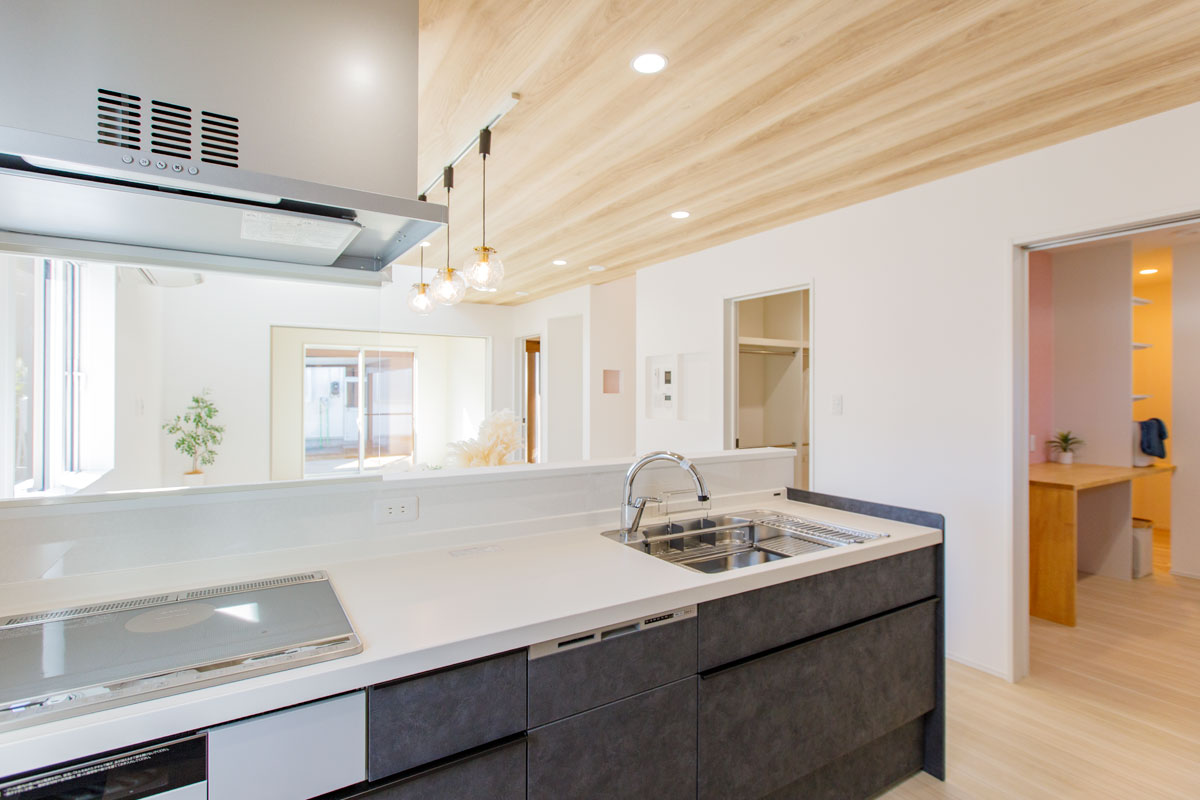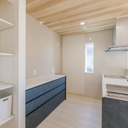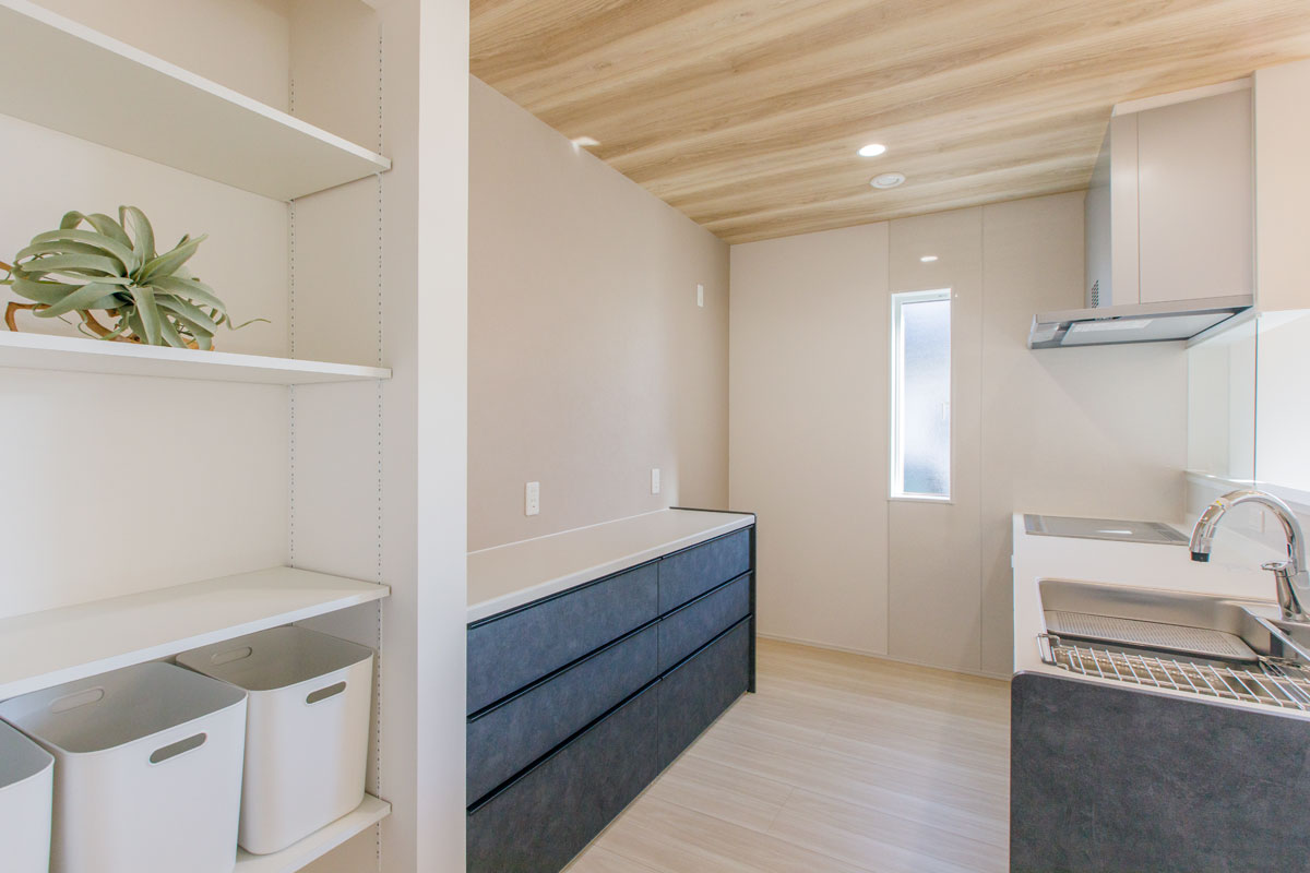 大容量のランドリールームは、キッチンの真横に配置することで家事の同時進行が数歩で叶います。