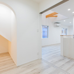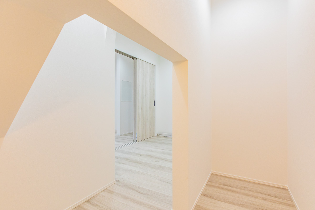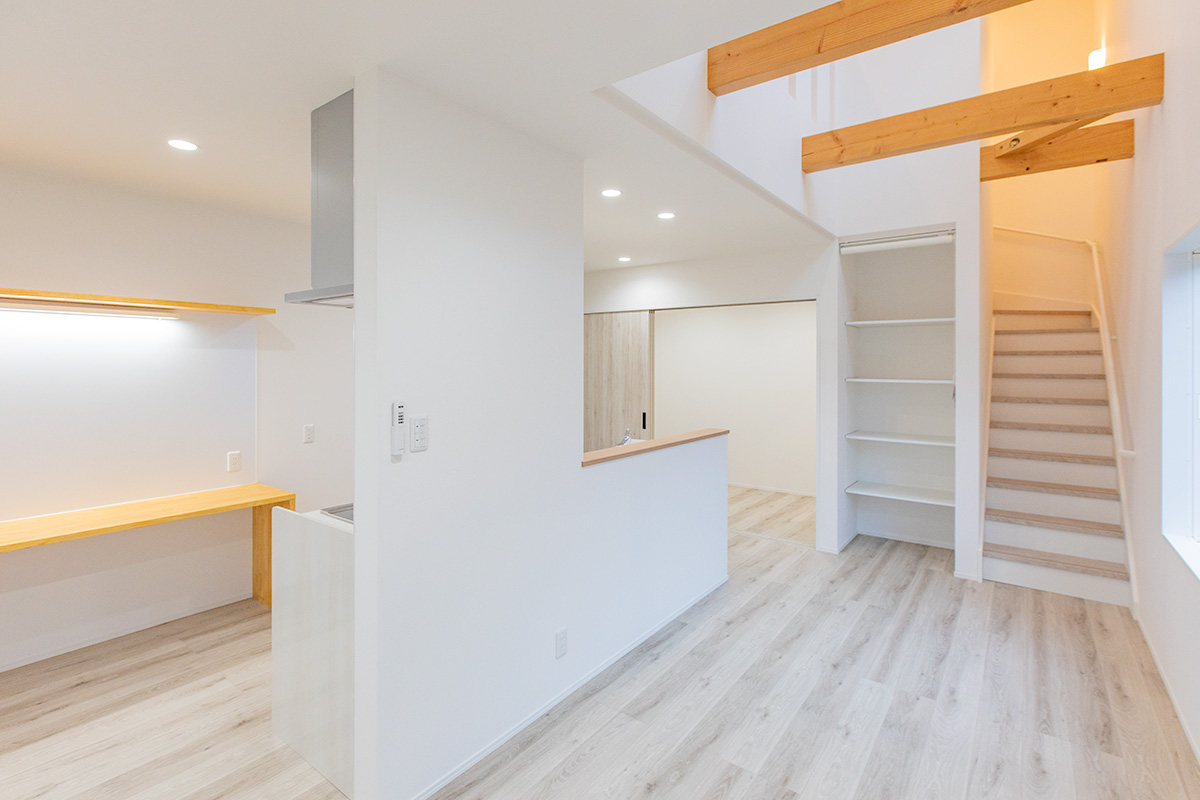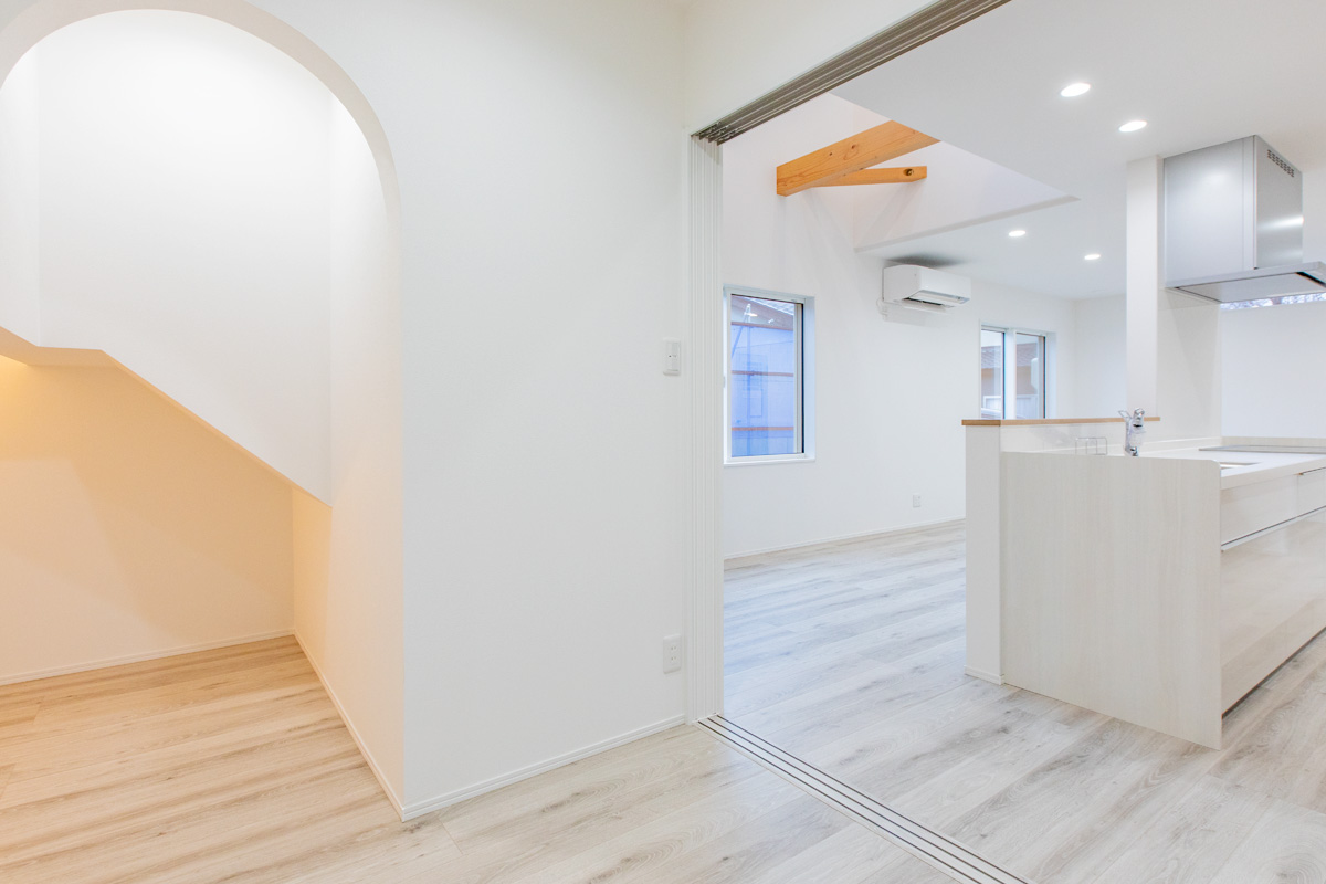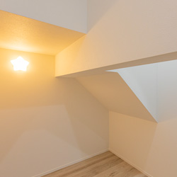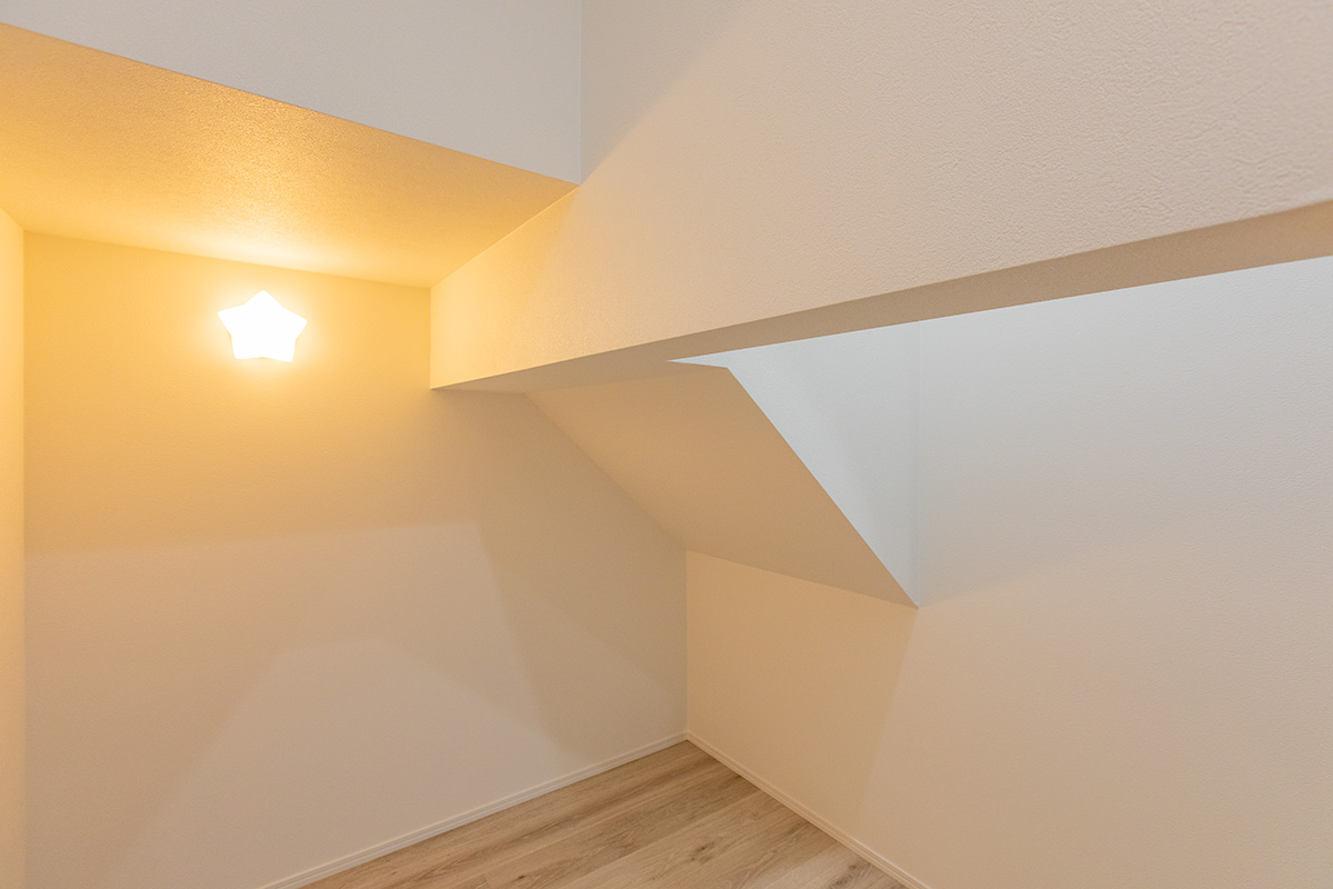 階段下にはヌックスペースを設け、お子さんのおもちゃ収納を兼ねた隠れ家のような場所に。