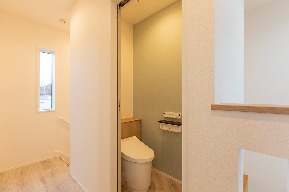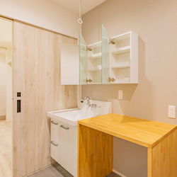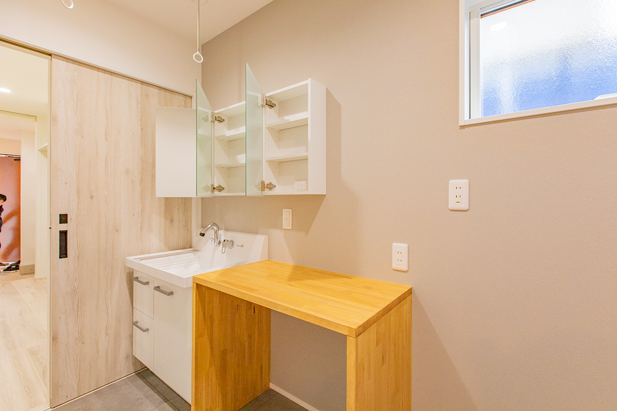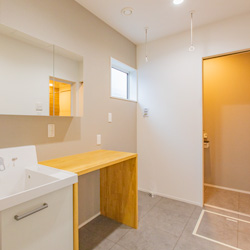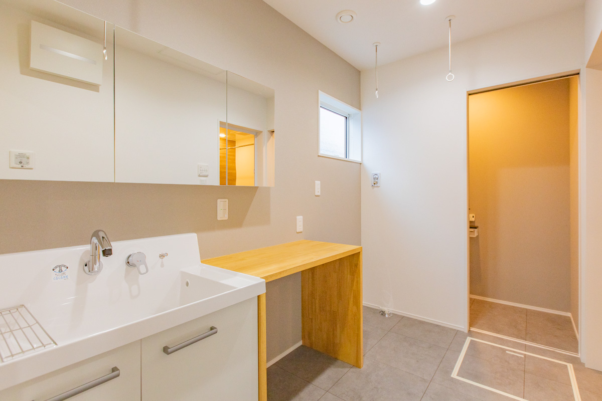 洗面脱衣室はランドリールームも兼ねた3帖を確保し、洗濯後に移動せずそのまま干せるように計画しました。