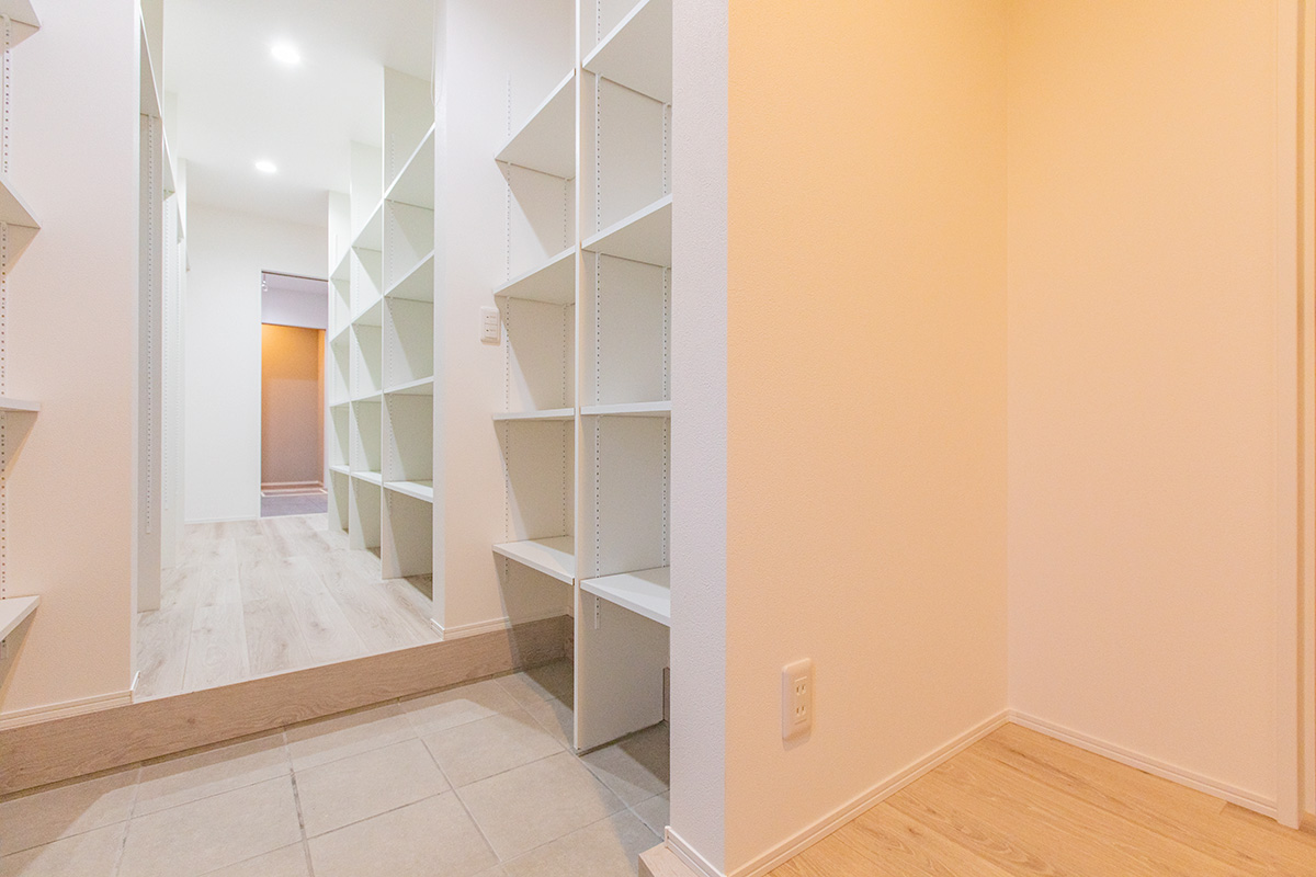 玄関からシューズクローク、ファミリークローゼット、洗面所までを一直線につないだ間取り。