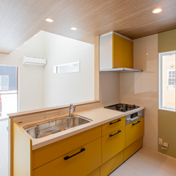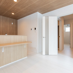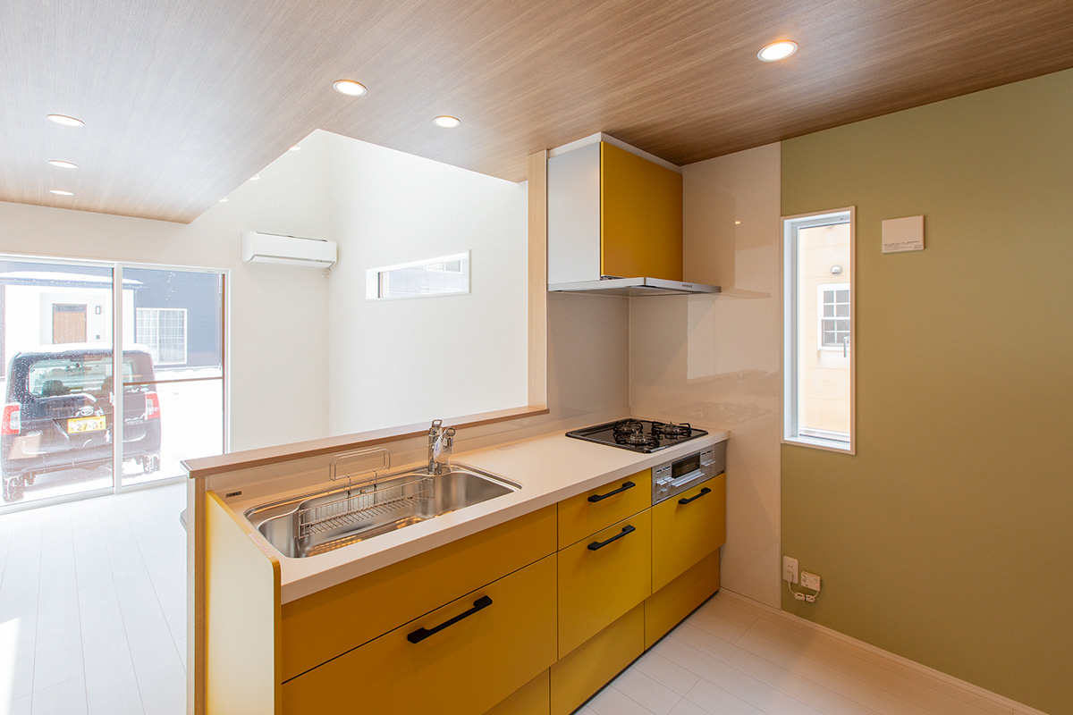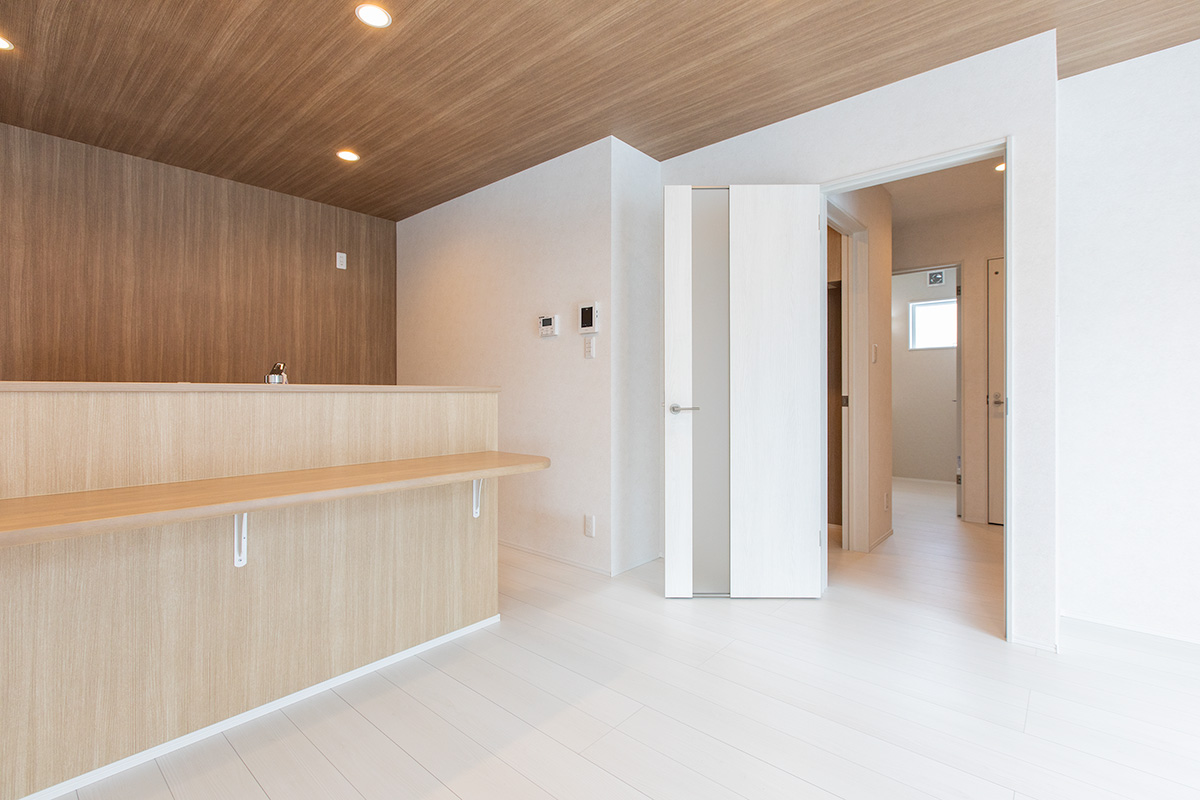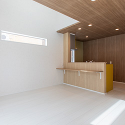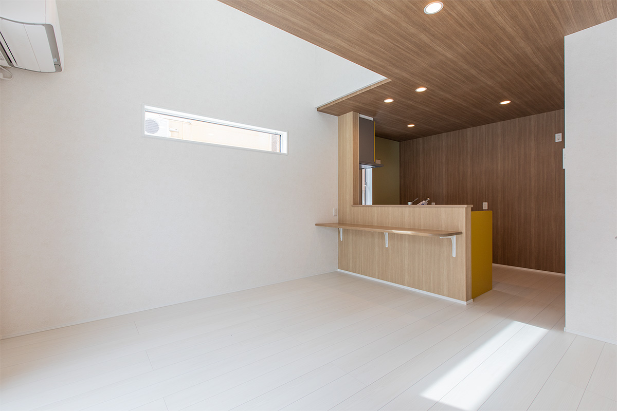リビングには吹き抜けを採用し、高窓からたっぷりと自然光を取り込むことで、実際の面積以上の開放感を演出。南面の大きな窓とあわせて、明るくのびやかな空間を実現しました。